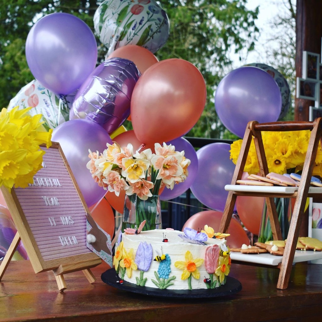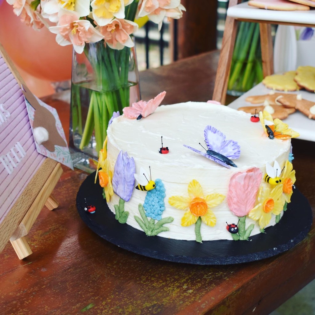 Dadda showed off his baking skills with a homemade lemon cake with a lemon curd and buttercream filling. The edible cake decorations blew everyone away. The only thing that wasn’t edible was the little tiny antenna on the insects. Everything else was buttercream or gum paste and hand made by him. He also did some spring inspired sugar cookies for an easy take home treat for our guests.