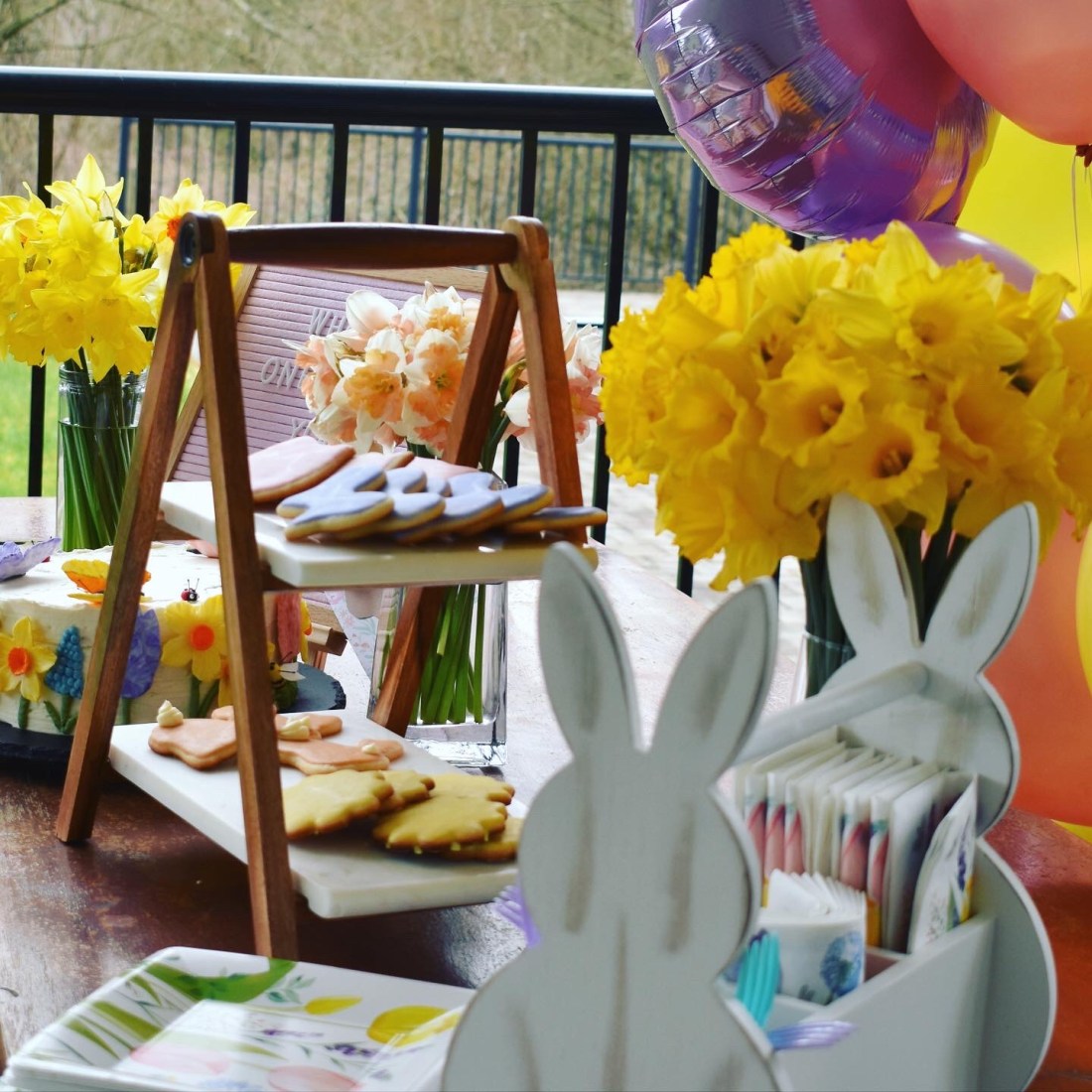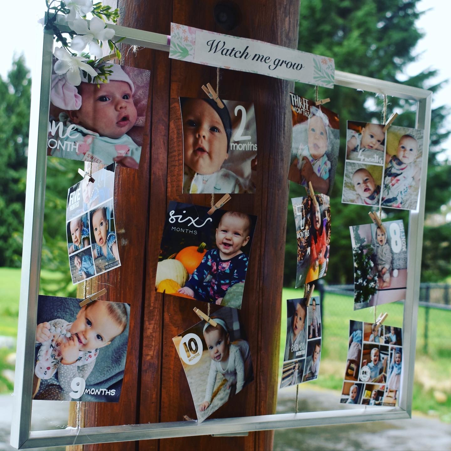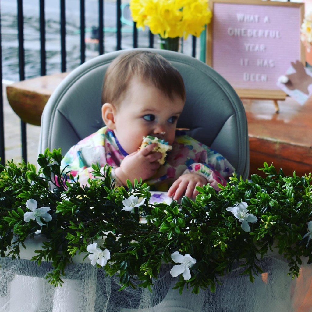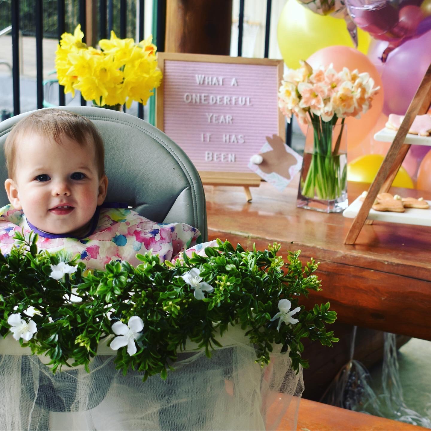 Minimal decor was needed because it was only the carport that needed decor so that made my prep a lot easier. I made a “watch me grow” 12 month photo frame, a best of the year collage frame, and used our local daffodils (perfectly in season). We grabbed some balloons, plates and napkins from a local party store and there you have it, decor was done! I revamped Annabel’s highchair skirt we used for her first by adding some greenery and little white flowers.